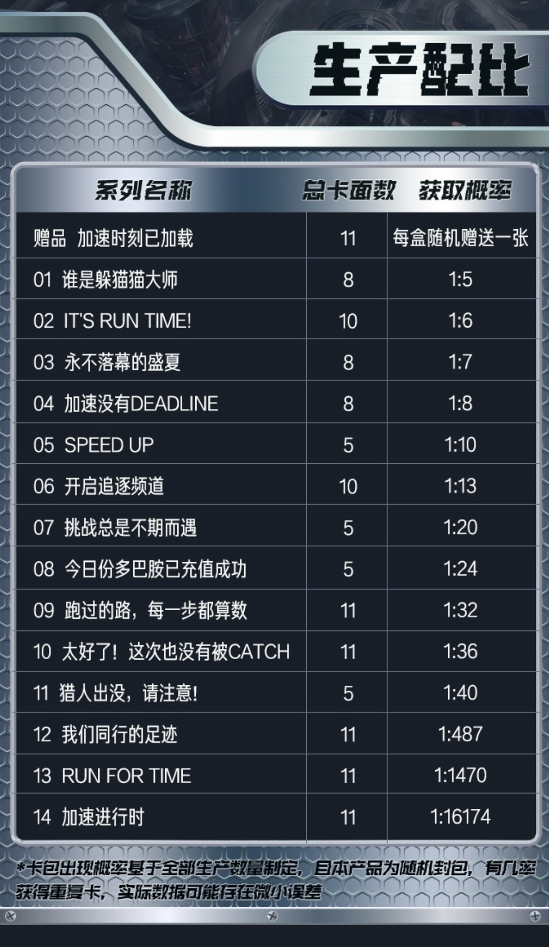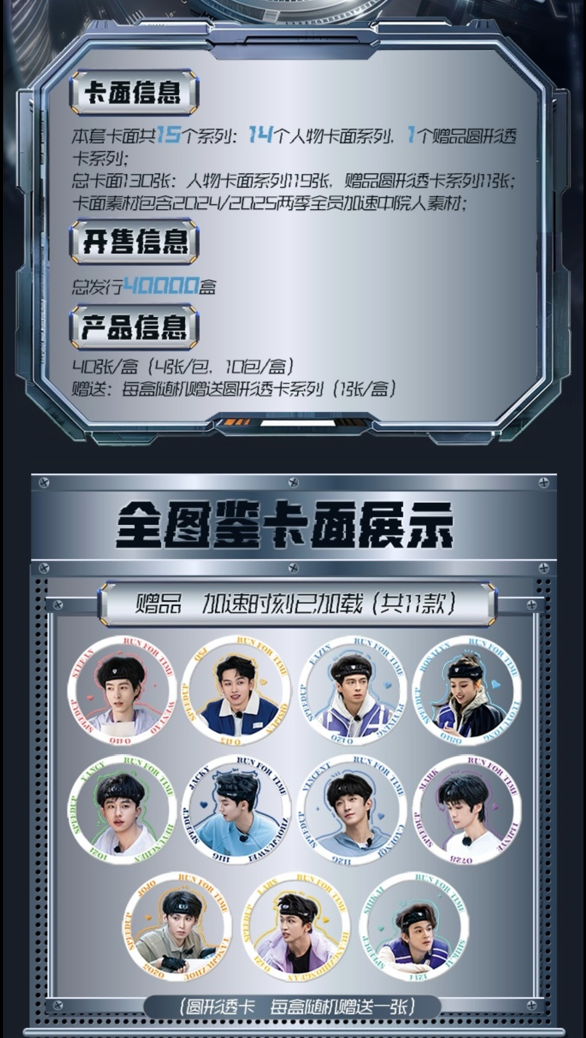 總卡面130張,人物卡面系列119張,贈品圓形透卡系列11張,卡面素材包含2024/2025兩季全員加速中院人素材